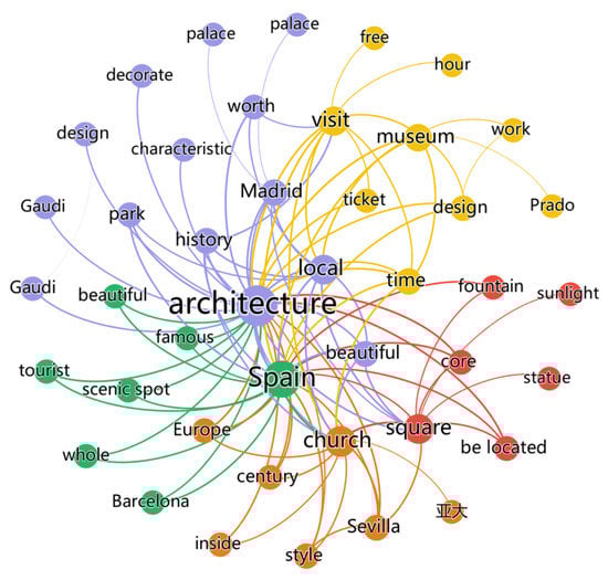 The results identified five clusters, each with a relative strength in a central topic that operated as the center of its cluster, as shown in Figure 3. The five relevant clusters were buildings, Spain in relation to the main cities, local in relation to visits, church in relation to museums, and other specific spots.