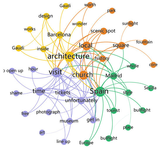 Negative aspects are shown in Figure 5. The nodes could not be extracted in a clear order, and they also occurred with much lower frequencies, which is indicative of the power of positive comments over negative ones. However, the same clusters were repeated, although with a different arrangement. The resulting clusters were “architecture”, “Spain”, “visit”, “church”, and “local”, which represent areas of improvement for the tourist destination.