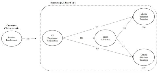Satisfaction is a major factor in determining repeat purchases and WOM, and is a typical antecedent of loyalty [,]. Park and Park [] confirmed that the attributes of e-stores influenced satisfaction and that customers satisfied with e-stores continued to use and recommend the attributes to others, showing high loyalty. Since VF applied to the online environment stimulates communication between customers and satisfies their desire for self-expression, it is highly likely to be shared on social media []. In a similar vein, Sung [] found in a study on the AR advertising effect of mobile apps that customers who were satisfied with AR advertising content not only formed purchase intentions but also voluntarily shared brand experiences with their social groups. Brand advocacy, formed voluntarily by individuals, has a significant influence on the purchase decisions of people in the same community based on trust []. In particular, SNS, the digital media customers use most often for eWOM [], influences purchase decisions by allowing customers to exchange information and personal evaluations quickly and easily []. Therefore, this study proposed the following hypothesis: