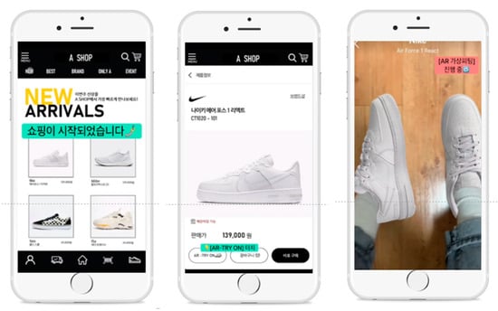This study ensured accuracy in the prediction of actual behavioral responses by presenting scenarios of shopping situations and a video using mobile VF as stimuli so that study participants could respond to the questionnaire. The shopping item in the video was a sports brand, which was selected because it is less affected by gender and age than other alternatives. Well-known sneakers brands (N* and A*) were used to increase the sense of a real shopping experience. A mock mobile app for the virtual shoe editing shop brand, “A Shop,” was created for the research. The experience of the AR fitting service offered by “A Shop” was rendered in a video clip and used as a stimulus (see Figure 2).