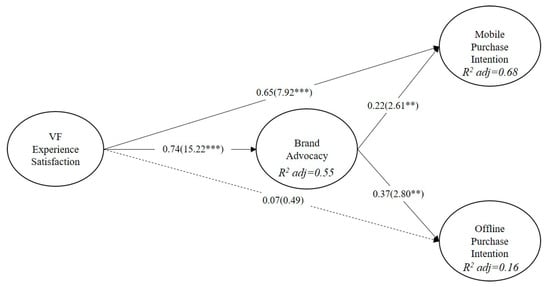 In this study, the significance and suitability of the path coefficients were verified through 5000 bootstrap resampling to identify the effect of VF experience satisfaction on brand advocacy, mobile purchase intention, and offline purchase intention. The results are presented in Figure 3 and Table 5.