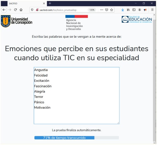 The data was collected between November 2020 and January 2021, through the application of a virtual Lexical Availability Test (LAT) consisting of three items related to three centers of interest: (1) ICTs in teachers’ specialty, (2) students’ emotions perceived by teachers when using ICTs in class and (3) emotions teachers want to modulate in their students during the class to improve involvement with the learning task. The test included a demographic survey where teachers provided information such as years of experience, academic degrees (Bachelor, Master, PhD), school type (public, subsidized, private, other) and the subject matter or knowledge area.