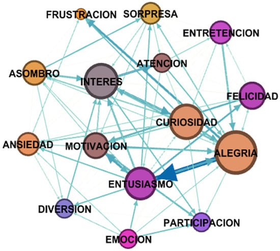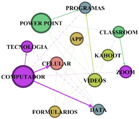 The generated graph presented links with greater strength between the words COMPUTER—DATA, COMPUTER–CELLULAR, POWER POINT–PROGRAMS and CLASSROOM–ZOOM. The latter related to technologies that are commonly used in remote classes, as well as words such as APP, VIDEOS and FORMS.