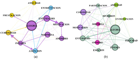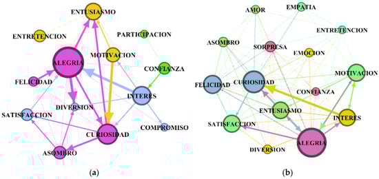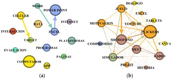 Figure 2 shows that the graph of the female participants had greater connections between the nodes than the male participants’ graph. Specifically, the words that the female participants used regarding ICTs were more closely related to each other, which could mean that their latent vocabulary was more homogeneous. Among the most used and related words in the female participants, we found technologies with greater relevance to the educational context experienced in a pandemic. There were also nodes attributed to emotions, something that was not present in the graph of their male counterparts. This relationship between ICTs and emotions shown by the female participants seems relevant, as it may lead this group to better relate emotions to technology use, also presenting latent words related to more didactic digital tools. The words that the male participants reported in relation to ICTs, however, showed a more common use.