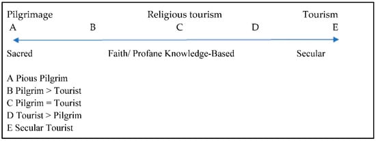The tourists interested in religious sites have been identified as placed between two poles, one associated with the sacred, the other with the secular, on an imaginary continuum, as illustrated in Figure 1 []: