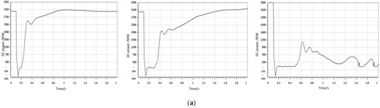 If a fault simulation of a three-phase short circuit is set at the midpoint of a 500 kV line of YH HVDC at 0.1 s, the fault is cleared at 0.5 s. The changes in electric quantity before and after the installation of DRPCE are shown in Figure 5 and Figure 6, respectively.