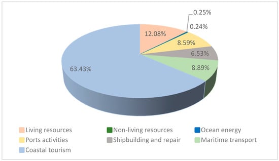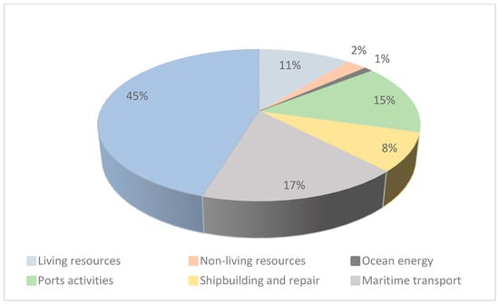 People’s lives and economies would not be the same in the absence of the activities carried out in seas and oceans. Therefore, the blue economy is a very important part of the European economy, as it provides food and other resources, supports tourism, facilitates transport, and generates the production and use of renewable energy. Regarding the blue economy of the EU, seven established sectors sum up all the blue activities: marine living and non-living resources, marine renewable energy, port activities, shipbuilding and repair, maritime transport, and coastal tourism. These seven established sectors have a contribution of around 1.5% to the European Union’s economy in terms of gross value added, and they employ over 2.2% of the employed persons in the EU []. Coastal tourism, maritime transport, and its related sectors are the largest sectors in terms of the value added at factor cost.