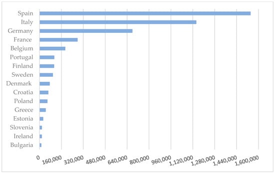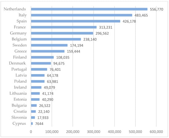 Twenty-two of the EU member states practice maritime transport. Thus, European shipping possesses a large share of the world’s fleet (over 40%), accounting for some of the world’s biggest maritime clusters. According to the Eurostat data, the total gross weight of goods transported through EU short sea shipping amounted to 1.8 billion tons, consolidating the recovery registered after the economic crisis of 2009. In recent years, ship sizes have been increasing, leading to the intensification of the activities for shipbuilding and repair and port activities. These new larger ships have a reduced impact on the environment, following the European Green Deal. Member states’ contributions to the European blue economy are heterogeneous, depending on the geographical position, sectoral structure, and specificities of the economy. As expected, the blue economy has larger shares within the national economies of insular countries or member states with wide sea openings, such as Greece, Croatia, Malta, Cyprus, or Portugal. However, when it comes to the contributions of member states to the EU blue economy, particularly in terms of gross value added, the structure/type of blue activity provided commands the main influence. For instance, economies with significant gas and oil industries, which imply a large share of gross investments and low employment intensity, are likely to provide a larger contribution to the gross value added of the blue economy at the EU level. Yet, countries specialised in coastal tourism, which is labour intensive, have a larger contribution to the EU blue economy in the area of employment when compared to gross value added or to gross investment [].