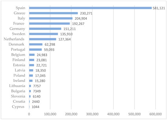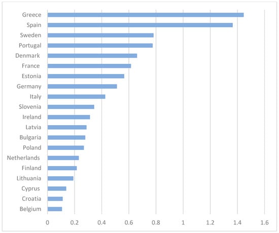Between 2007 and 2018, Spain reported the highest average value of investments in maritime transport of the EU member states, followed by Italy, Germany, and France (Figure 5). However, it is worth mentioning that the data for Cyprus, Latvia, Lithuania, and the Netherlands are not available.