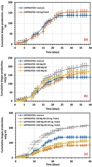 - Abdelsalam, E.; Samer, M.; Attia, Y.A.; Abdel-Hadi, M.A.; Hassan, H.E.; Badr, Y. Influence of zero valent iron nanoparticles and magnetic iron oxide nanoparticles on biogas and methane production from anaerobic digestion of manure. Energy 2017, 120, 842–853. [Google Scholar] [CrossRef]