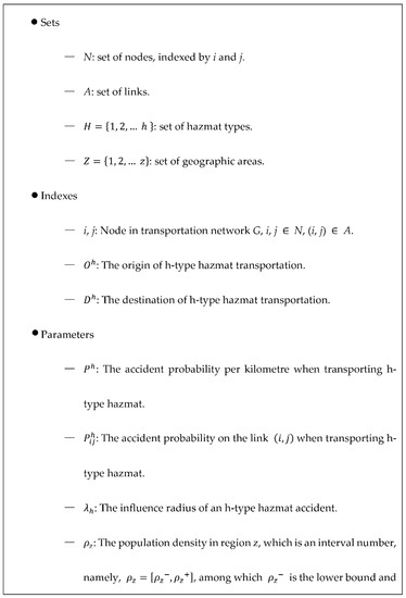 The transportation network is represented by a graph , where N is the set of nodes and A is the set of links. The transportation of hazmat requires the carrier to transport various hazmat types through the road network from the starting point to the end point. There are multiple feasible routes for the transportation of hazmat between the starting point and end point. The constructed route optimization model of hazmat can select the optimal transportation route in order to meet the expectations of the government, the carrier, and the public. The parameters and variable symbols used in this paper are described in Figure 1.