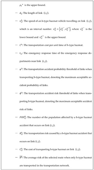From the perspective of the carrier, the transport cost refers to the cost of fuel. In this paper, the transportation cost considered by the carrier is expressed as the time cost, which is related not only to the travel distance and the driving speed of the vehicle on the link , but also to the transportation cost per unit time of h-type hazmat. Considering that the speed of an h-type hazmat vehicle travelling on link is uncertain, it is treated as an interval number, that is, .