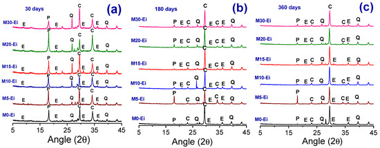 Figure 5a–e shows XRD patterns of mortar KR 800 °C aged under internal environments (Ei) for 30, 180, and 360 days (Figure 5a–c) and external environments (Ee) for 360 and 512 days (Figure 5d–e). The portlandite (Ca(OH)2, JCPDS 72-0156); ettringite (3CaO·Al2O3·3CaSO4·32H2O, JCPDS 72-0646); calcite (CaCO3, JCPDS 05-0586); and quartz (SiO2, JCPDS 46-1045) were phases identified in the mortars exposed to the internal and external environment. However, the intensity of the portlandite phase peaks decreased with time. Such behavior is strongly related to the pozzolanic reactions and the carbonation process. This indicates that the pozzolanic reaction and the carbonation process, over time, have consumed the portlandite.