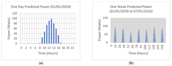 The previous results in Figure 10 validate the accuracy of the prediction by means of comparison between actual and predicted power. Figure 11 shows the capability of the proposed model to use the already-trained neural network to predict power for any span of time without the presence of real-time weather data by utilizing historical data only. Figure 11a–d show the predicted power for one day, one week, one month and three years using the proposed algorithm. This shows that the proposed model is quite flexible in predicting power for various time periods.