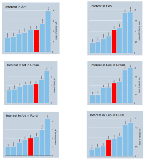 Figure 2 helps us to appreciate the level of cultural valuation and sentiment that the geographies of flowers and geographies of flower power enjoy across the seven countries that are available in our dataset. Both measures of activism in art and activism in ecological organisations are on the same scale, and thus the mean values of them can be compared. This is especially true as the population in every country is around 1000 respondents, so we can safely compare the means between the countries. The only exception in this case is Germany, which has about 1500 respondents in the WVS. This comes to say that the mean for Germany will be eventually understating the level of affect in the country in comparison to the other countries in the dataset. (Affect is a main term coming from the psychological realm, referring to the strength of sentiment independent of whether the sentiment associates with a positive or negative feeling. Put differently, the degree of affect corresponds to the strength of the feeling (see [67,68]).