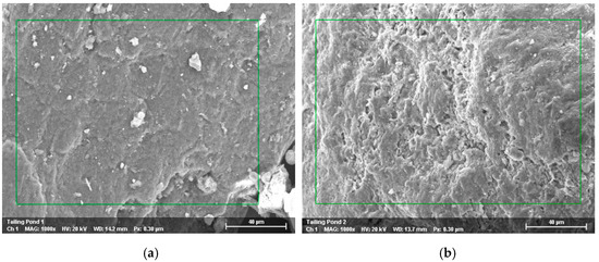 Minerals such as wollastonite and magnetite are the most remarkable minerals that are commonly used in mineral carbonation industries, and these minerals were found in the waste dump, tailing pond 1, and tailing pond 3. However, in the iron ore mining-waste samples, Mg-bearing minerals such as diopside and magnesium aluminum silicate were only minorly present compared to Ca- and Fe-bearing minerals (Table 3). Other than quartz, the major minerals found in tailing pond 1 were magnetite, while for tailing pond 2 anorthite and perovskite were present. On the other hand, for tailing pond 3, the major minerals present were anorthite, titanium silicon, johannsenite, magnesium aluminum silicate, and magnetite. The mineral composition of mine tailings comprised of anorthite, titanium silicon, and diopside. While the major minerals found in the waste dump were anorthite and wollastonite. As observed from the XRD results, all of the samples contained the Ca-, Fe-, and Mg-bearing minerals that are needed for the mineral carbonation process. Generally, the more dominant minerals found in the sediment samples were quartz followed by anorthite. The presence of anorthite in the samples was depicted by their flake-like anorthite crystal shapes as identified from the SEM micrographs analysis (Figure 5). Clearly, the presence of Ca- and Mg-silicate minerals is essential for mineral carbonation and can be useful as a supplementary cementitious material [33].