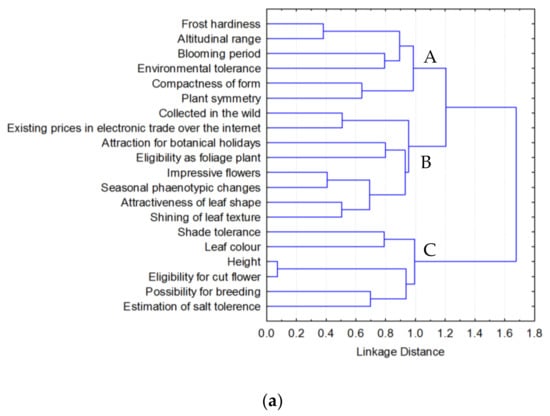 - In the case of Moroccan (Mediterranean coast-Rif) endemic plants (Figure 4b), three basic clusters were differentiated: Cluster A with some plant habit-related attributes (plant symmetry, environmental tolerance, blooming period) grouped together with some others related to perceived value from human viewpoint (height, eligibility for cut flower, estimation of salt tolerance, impressive flowers, shining of leaf texture), cluster B with the rest of the plant habit-related attributes (compactness of form, altitudinal range, frost hardiness) and cluster C with five attributes which are related to perceived value from human viewpoint (n = 5).