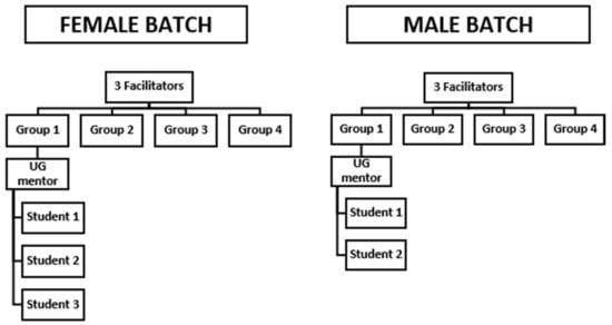 Graphical representation of facilitator, mentor, and student distribution in each female and male batch. During the first week, there were two female batches; each batch consisted of four groups of students and was administered by three facilitators. Each group of students comprised of one university undergraduate student and three middle school students. Similarly, the second week carried out two male batches of students. One group of students withdrew from the course in between, leaving three male groups (second batch) at the end of the week. The three facilitators covered both the male and female batch of students.