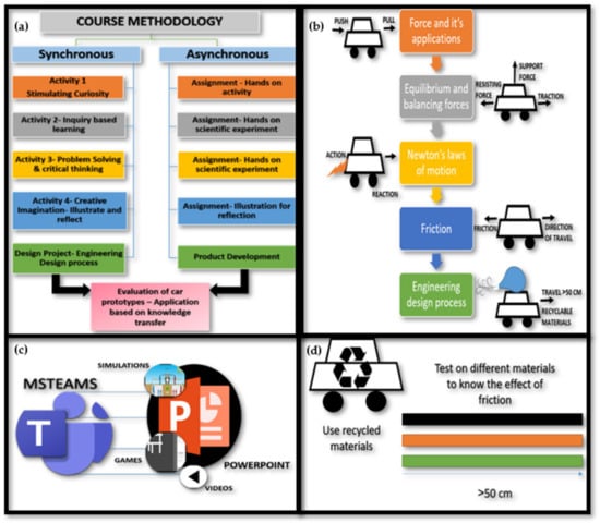 Graphical representation of course methodology is displayed along with learning standards and digital resources implemented. (a) A set of asynchronous and synchronous activities implemented during the course from day 1 to the end of the course. (b) Learning standards that are focused on each synchronous activity commencing from introduction of force to transferring knowledge by creating a “product car”. (c) Digital resources implemented to provide course, with MS Teams (File:Microsoft Office Teams (2018–present).svg.) as learning platform and PowerPoint presentation (File:Microsoft Office PowerPoint (2018–present).svg.) [,] to present the content through games, videos, and simulations. (d) Evaluation criteria of final product car made from recyclable materials, by testing it on 2–3 different materials with different surface friction, capable of covering a minimum distance of 50 cm.