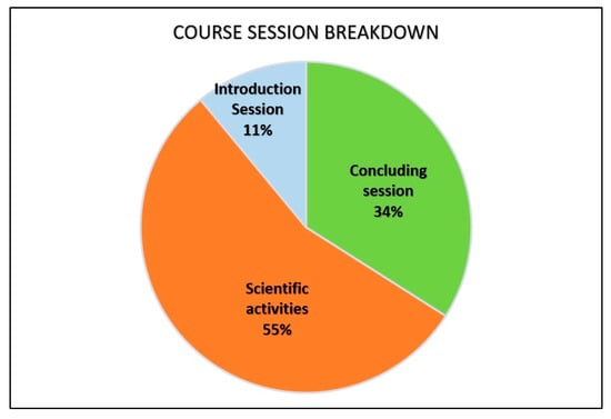 Each day facilitates a ~60-min learning session as per student preferences to promote flexible learning opportunities on a real time learning platform. During the synchronous session as illustrated in Figure 3 and Table 1, the session was categorized into sub sessions —introduction session, scientific activities session, and concluding session. The scientific contents and the learning objectives were addressed during the scientific activities sub session, whereas the other two sub sessions mainly focused on the smooth functioning of the course session. The three sub sessions are distributed accordingly in Table 1.