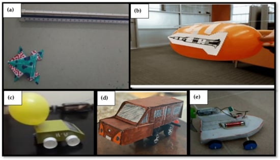 The students exhibited enhanced participation for hands-on activities despite the restrictions of accessing the materials on their own in contrast to having been accustomed to settings with readily available materials at their school classrooms or labs. They even showcased their problem solving and critical thinking dispositions while accessing the required materials by replacing them with better alternatives in case of deficit. During the design project assignment, which was to be accomplished as teamwork, each member designed and developed a product independently, as they did not have the opportunity to gather around due to social distancing norms. Once they succeeded, they tested their products in front of their teammates via a web conference call. They displayed the product to each other and compared the results to choose the best design according to the criteria, in order to compete with other groups. Some groups even resorted to improving their final product even after meeting the requisite conditions. For example, in the case of one girls’ group, student 1 built a balloon car (as in Figure 4c) that was able to satisfy all the preset criteria. However, student 2 made a toy car, which also exhibited similar performance concerning speed and distance (as in Figure 4d). However, student 3 changed the design of the vehicle (car) to function itself as a boat as well, powered by a battery source, which was tested in a tub filled with water (as in Figure 4e) and chosen to be best in performance and design (videos of testing is available on request).