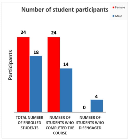 Student attendance was a major criterion to understand that they were interested in participating in the course, irrespective of the fact that the sessions were entirely voluntary. The motivational factors that drove the students to attend the courses out of their own free will could be attributed to intrinsic parameters like student interest, cultivated from the course. Moreover, since the course was organized during the summer vacation, it compensated for their free time. The students who attended the courses received merit certificates at the end of the course to participate actively without any fail, depending on their attendance. Table 6 and Figure 5 below provide the distribution of students who attended the course entirely and those who withdrew from the course. The withdrawal of the students was attributed to either medical unfitness in the case of one student or lack of interest in the case of other three as per the facilitators’ reports. However, we observed that the number of female students were retained until the end of the course in contrast to that of males. The drop-out males did attend most of the sessions; however, lack of interest in submitting assignments discouraged them from completing the voluntary program. However, the students were not forced to leave the course due to the incompletion of assignments.