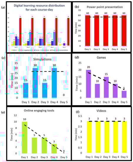 All digital resources were included in the course by cautiously considering the preferences of the students and balancing time management. They demanded activities based on simulations and games in their daily feedback, thereby inciting the developers and facilitators to include more weightage for the same. Videos were provided either to deliver content knowledge or to introduce a game and hence were mostly short timed to play as 1-min videos, limiting their maximum daily playtime to 3 min. Since PowerPoint presentations were used to deliver the whole session course content in the form of videos, games, simulations, etc., they were accounted to be implemented for the maximum duration. The online engaging resources include interactive applications like whiteboard for illustration and the wheel of names that was applied to select students on a fair basis for each game, thereby avoiding conflicts in the midst of session. The graphical representation of digital tool distribution that displays the daily usage of each digital tool during the respective session is provided below in Figure 7a–f.