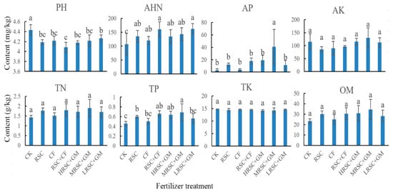 In zero fertilizer application tea garden, the soil pH was significantly higher than in the fertilized tea garden soil. Particularly, the alkali-hydrolyzable nitrogen (AHN) was significantly higher in the fertilizer applied tea garden soil compared to zero fertilizer applied tea garden soil. Besides, there is no significant differences observed in AK, TN, TK and organic matter (OM) contents in CK and fertilizer applied tea garden soil samples though TP and AP contents were higher in MRSC + GM treated tea garden soil (Figure 1).
