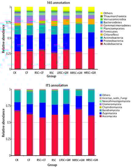According to Hiseq sequencing data on the phylum level, Acidobacteria, Proteobacteria and Actinobacteria are the most abundant bacteria, and Ascomycota, Zygomycota and Basidiomycota are the most abundant fungi (Figure 2). The relative abundance of bacterial species was higher in organic fertilizer applied tea garden soil than inorganic or zero fertilizer treated tea garden soil samples except Acidobacteria which was lower in RSC and MRSC + GM treatment. Specifically, Chloroflexi bacterial species population was higher almost 50% in organic fertilizer (RSC) treated soil samples followed by other bacterial species. However, the abundance of Firmicutes was lower in RSC applied soil than other fertilizer treatments. For the fungi, very little Basidiomycota population was observed in MRSC + GM treated tea garden soil.