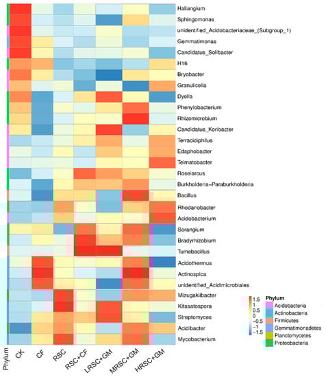 As shown in Figure 3, the significant level microbial population differences were observed between the fertilizer applied and zero fertilizer applied tea garden soil. In control tea garden soil, Haliangium, Sphingomonas, Gemmatimonas and Candidatus Solibacter are the dominant microbes. In inorganic fertilizer applied tea garden soil (CF), Acidothermus and Actinospica are the dominant microbial species. In organic fertilized soil (RSC), Mizugakiibacter, Kitasatospora and Mycobacterium were the most abundant microbes. In contrast, the abundance of microbes significantly changed in integrated application of RSC with different manures.