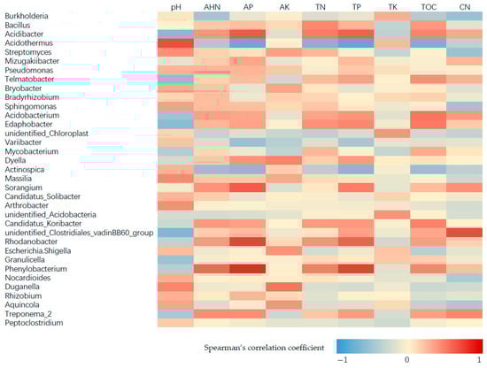 Spearman’s correlation between bacterial communities and soil properties by different fertilizer treatment.