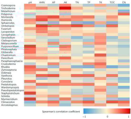 Spearman’s correlation between fungal communities and soil properties by different fertilizer treatment.