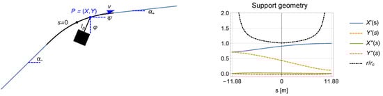 The damping of the pendulum arises from two parts: a mass-independent part coming from the damper (two discs pressed together with a constant force, one fixed at the carrier truck, the second at the hanger) and a mass-dependent part caused by the drag bolt/socket, which is proportional to the weight of the vehicle. Both contributions obviously act in an opposite direction to the angular velocity, where the angular velocity of the carrier truck also plays an important role (see left part in Figure 1). To describe the path of the carrier trucks, we use a mathematical approach, presented in detail in []. Here, we need the main results only: For a given support head geometry, we can find a parametrization that fits well with the real structure (similar to a clothoid) and has the properties of finite first and second derivatives (analytically available), see Figure 1. We describe the path outside the support head with straight lines. The length of this path was chosen to be as short as possible, such that this approximation is sufficiently fulfilled (the exact trajectory of the ropeway vehicle is more involved, even within a quasi-static calculation []), and as long as needed to ensure well-defined initial conditions for the pendulums, so that the phase-space trajectories start at the origin. In all considerations, the air resistance was of minor influence and neglected. The parameters of the system, which are important for this investigation, are listed in Table 1.