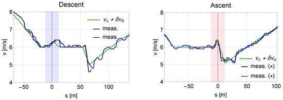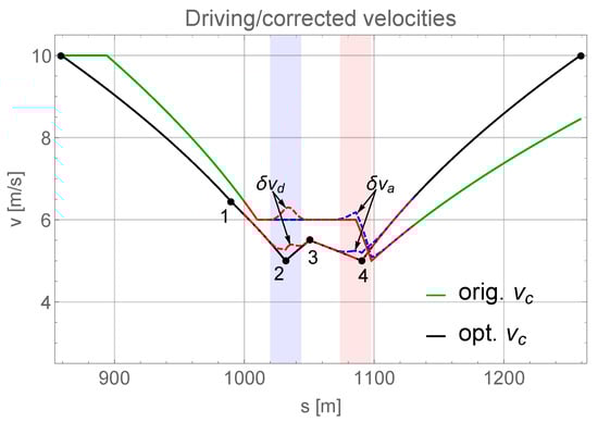 By minimization of J, we obtain the four points for the optimal velocity within the interval , where = 400 m, see Figure 3. Since we allowed for variation of the positions of the four points within small regions around the support (ensuring disjunct intervals in position), the run-time was essentially constant and equal to the original run-time. An incorporation of the run-time in the cost function J was therefore not necessary []. In order to better approach the measurements in which we used empty vehicles, the minimization of J was executed for the empty vehicles as well. However, it turns out that the solution depends only negligibly on the vehicle mass. This indicates that the obtained optimal velocity profile is rather robust under different loadings (to capture the mass dependency, it is possible to generalize the cost function by summation over many loads).