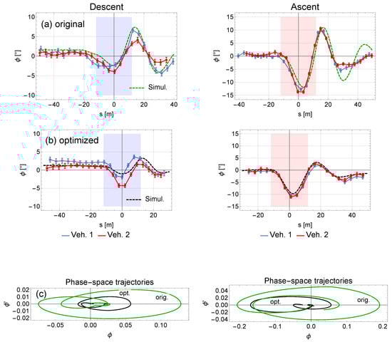 We start the discussion with Figure 2, which shows the measured vehicle velocities (vehicle 1 only, where in the video this is the vehicle in the background) for the descent and ascent case. In order to estimate velocity fluctuations for different rides, we made several measurements, where two of them are plotted for both driving directions. The dashed lines correspond to the theoretical corrected velocities, using the Gaussian modifications according to Equation (2). Figure 3 shows the optimal and the original velocity profile, together with the Gaussian corrections. The four labeled points indicate the solution of the minimization of J. The solution shows a slower speed, compared with the original velocity profile. This is not surprising, because we set the minimal allowed velocity at 5 m/s—more interesting, however, is the position of the points 2 and 4, which are located at the support head. This is also in contrast to any traditional velocity profile, where one simply decelerates before and accelerates after the support passing. Figure 4 contains the results of the video evaluation, the pendulum angles for the original (row (a)), and the optimized velocity profile (row (b)) for both vehicles and both driving directions. The results of simulations are also shown. One can see a difference between the two vehicles in the measurements, in particular for the descending ride in (b), where in the region …−15 m, a constant deceleration along a straight line should result in equal pendulum angles, which indeed is not the case. Since an uncertainty in is certainly not the reason for this difference, we believe that it is caused by a weak blowing wind. The most significant effect of the optimization is visible in the ascending ride. From (a) to (b), we can see that the second swinging is reduced from to . In panel (c) we plotted the corresponding phase-space trajectories in the most interesting parameter region. The trajectories for the optimal velocity profile are contracted to the origin, which also demonstrates the effectiveness of the optimization. In Table 2, the measured/simulated results for some quantities are summarized. We observe a reduction of the cost function J and the max. amplitude of the vehicle oscillations for both driving directions, where simulations and measurements coincide better for the ascending ride, since the relative measurement error is smaller.