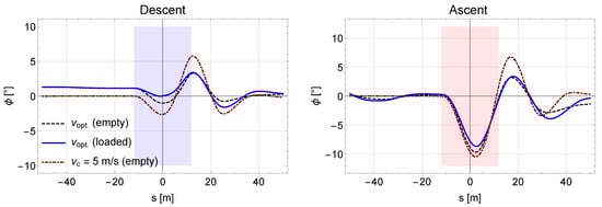 The values of the pendulum angle depend only weakly on the load, as we confirmed by simulation and observation. This is reported in Figure 5, where we plotted the pendulum angle for the optimal velocity profile and the empty and loaded vehicle. The influence of the vehicle’s mass on the pendulum angle is more relevant for the damping than for the reduced pendulum length . We also checked a traditional velocity profile, where the vehicles pass the support with constant velocity of = 5 m/s, augmented by the introduced Gaussian corrections , . We obtained for the oscillation amplitudes for the descending/ascending rides.