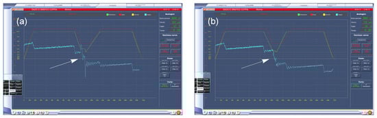 Screenshot of the control window of the computer at the mountain station for both velocity profiles, where (a) gives the original case and (b) the optimized case, respectively. The yellow lines are the velocity profiles, and the lines in cyan give the torque measured at the electrical engine. As one can see in the center of the images, in (a) the torque shows two peaks when the vehicles pass the support, which disappear in (b) (white arrows).