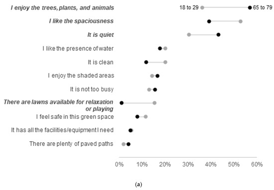 Our study has demonstrated the importance of investigation into variations in the valuation of UGS characteristics. We find two clear bundles of users (nature-oriented and social) and differences in valuation between them. We also find that socio-demographic factors such as age, household composition, and use patterns do play a role in the valuation of UGS characteristics. Certain socio-demographic groups are inclined toward either nature-oriented or social use patterns. Older users tend to use UGS for nature-oriented purposes, while younger users and users with young children living in the household more often use UGS for social purposes. The latter appreciate the functional aspects of UGS, such as the provision of facilities. The presence of a child in the household corresponds with a perception of noise or lack of facilities as a negative characteristic of their UGS. This suggests that one’s living situation can impact liked and disliked UGS characteristics.