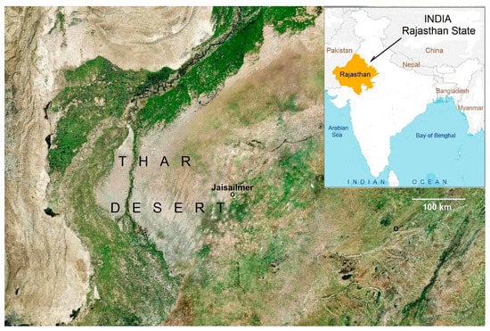 The arid-zone settings predisposed by the specific geographic and geomorphic configuration and the atmospheric regime gave rise to a variety of biotopes and ecosystems characteristic of the territorial climatic and geographic zonality []. The original natural settings are becoming more vulnerable to the climate- and human-generated changes. The Thar National Park (a UNESCO World Natural Heritage Site)—the largest (3162 km2) among the biosphere reserves and the protected natural areas of western India—includes, except for scenic landscapes, pristine desert habitats with unique wildlife []. Biogeography preservation of the most threatened places is of utmost importance.