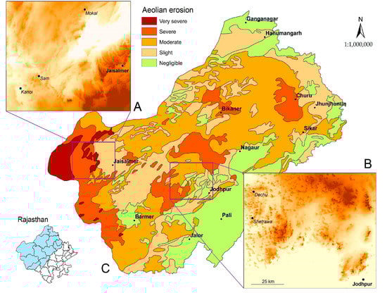 Aeolian erosion of western Rajasthan with the Digital Elevation Model (DEM) relief maps of the discussed areas: (A) Jaisalmer District and (B) Jodhpur District. The western and central parts of the country represent the most extreme SW wind- stream-affected geoenvironment with mass sand sediment-generating processes and the formation of barchanoid and longitudinal sand dune fields. Parabolic and transverse dunes are characterised by less severe, moderate to slight erosion–accumulation settings, respectively. The DEM sector relief (A,B) processing and projection this study; (C) the background wind-erosion map [].