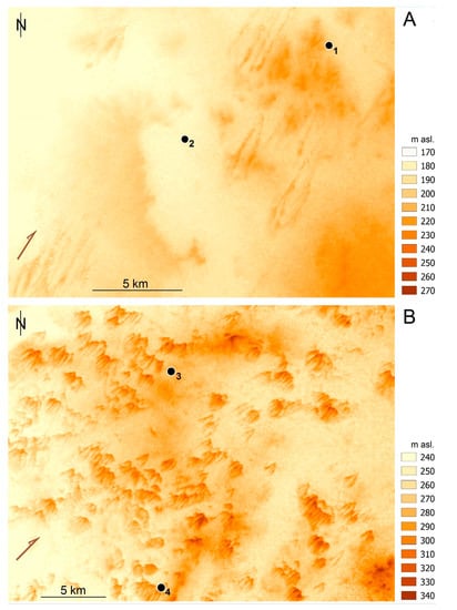 (A): Digital elevation model/DEM (the relief data SRTM 1 Arc-Second Global, resolution 30 m) with the projection of the longitudinal sand dune fields between Sam (1) and Kanoi (2), the Jaisalmer District. (B): DEM of parabolic dunes in the Dechu (3) and Shetrawa (4) area, the Jodhpur District, the western Thar Desert, showing the dominant SW–NE-oriented wind direction and aeolian sediment transport. For the geography of the aerial DEM relief maps see Figure 2.