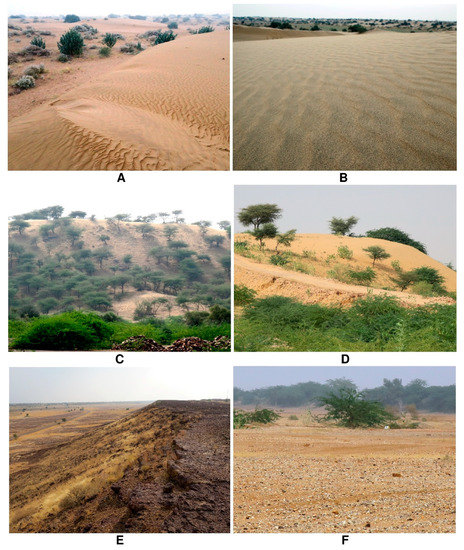 The average MAAT is ~25 °C with high summer temperatures (33–40 °C) and reduced winter temperatures 9–20 °C []. The broad seasonal air temperature range (−5 °C/+50 °C) contributes to an intensified physical and chemical sediment weathering. The increased windiness (with a wind speed >3 m/s) generates a large-scale sediment relocation mainly in the geomorphically most dynamic vegetation-free landscape settings (Figure 4A,B) leaving behind an exposed rocky bedrock and/or a gravel pavement surface (Figure 4E,F). Most of the country is covered by a sandy or wind-deflated rocky desert or semi-desert. Poorly developed regosolic and saline–alkaline soils prevail under a sparse desert vegetation cover and in seasonally inundated depressions, respectively. Overall poor water resources are primarily because of the scanty winter rainfall and the lack of major rivers/riverine channels flowing across/transecting this broad geographic region, most of which just with a seasonal flow discharge. Occasional summer monsoon floods add to the extremality of the Thar Desert contributing to the current environmental vulnerability of both the local natural and occupied settings.