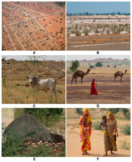 (A): Aerial view of the partly cultivated Thar Desert near Jodhpur with scanty bushy vegetation cover characteristic of the arid zone of NW India (AZ II); (B): Degraded agricultural lands (AZ IV) with top ground salinization caused by excessive irrigation and seasonal water evaporation (Pokaran); (C): Exposed Proterozoic (rhyolite) bedrock landscape subjected to present desertification near Agolai with perennial, seasonally dry stream channels and semi-desert vegetation used for the pastoral economy; (D): Arid rocky desert land near Mokal used for camel herding; (E): Traditional grass-roof huts of the Thar rural inhabitants with a stone-slab circular alignment; (F): Women of the Gadia Lohars nomadic tribe, the Dechu sand dune field, western Rajasthan (photographs by the author, November 2017).