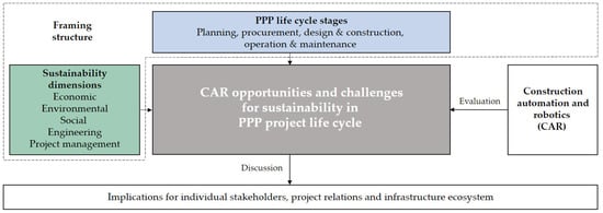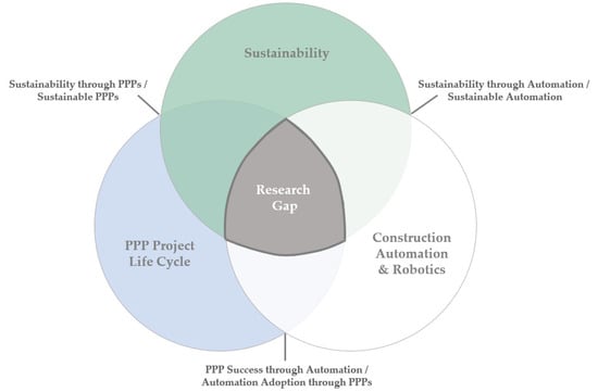 Overall, there is a lack of research on the integration of technological innovation into PPP structures []. Findings indicate a high potential to leverage sustainability across the life cycle of PPP projects through automation and robotics, but no approach has yet investigated the links between all three fields in a holistic way as visualized in Figure 1.