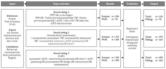 The literature review aims to identify relevant sustainability dimensions, PPP life cycle phases and key characteristics as well as CAR categories and performance issues with respect to the sustainability dimensions and PPP stages (Figure 2). All three topics show a broad scope of literature sources. Therefore, a semi-systematic literature review is conducted to answer research question 1. Semi-systematic literature reviews are used to provide an overview of a topic and its research development over time. It aims to present the developments and current state of knowledge in the three areas under review []. This type of analysis should be used to identify themes, theoretical perspectives, or common problems within the defined research disciplines []. Framework conditions for the literature to be selected were specified. To generate the appropriate literature sources that address the interrelationships of the three defined topics, search strings were generated. Figure 3 presents these conditions as well as the results of the paper selection process. Documents found with the defined search strings were evaluated according to the established rules. Unfitting articles (e.g., agriculture or aerospace technology) were ruled out based on title and abstract.