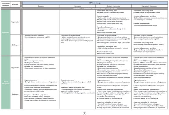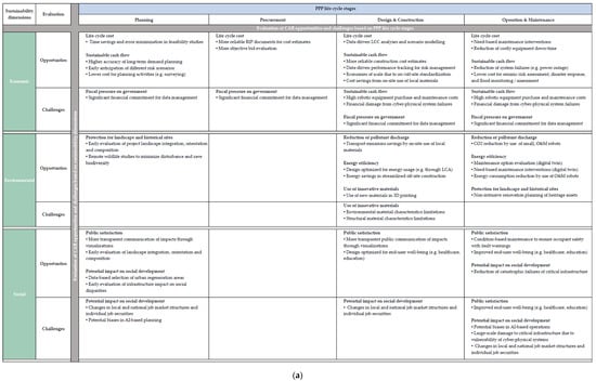 Based on the literature review, a framework was derived that comprehensively summarizes the key sustainability opportunities and challenges of CAR across the PPP life cycle. All aspects in the framework built on the previously presented literature findings. As shown in Figure 4, the sustainability dimensions and PPP project stages define the structure based on which the CAR impacts are evaluated.