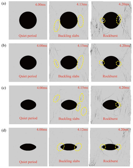 Figure 8 displays the numerical simulations after the rockburst. With regards to the shape of the rockburst pit, all the pits of the samples presented the V shape. Notably, as the fragments were not completely ejected in the simulations, the shape cannot be called V-shaped. However, the development trend of the crack can be estimated to be V-shaped as per the shape of the crack. Due to the disturbing load, the sample produced an oblique shear crack, which penetrated from the pit damage position to the upper and lower surfaces of the sample, forming an oblique shear crack penetrating the cavity. A certain angle forms through shear failure. While oblique shear cracks were generated, horizontal and vertical tensile cracks appeared around the cave wall, and these two types of cracks were connected with oblique shear cracks. The damage of the sample is mainly shear failure. There are tensile stresses above and below the cavern, and so horizontal tensile cracks appear. Due to the excavation of the cavern, there is unloading on the left and right sides of the cavern. Due to the vertical pressure and unloading, vertical tension cracks appear on the left and right sides of the cavern. The above three types of cracks appeared in the simulation experiments. It can be seen that the larger the axis ratios, the larger the shape of V-shaped pits.