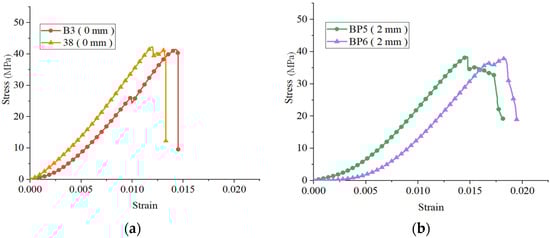 Figure 8 shows a comparison of the stress-strain curves of the uncoated coal and those coated with 2 mm, 3 mm and 4 mm of TSL. Each group of 2 mm, 3 mm and 4 mm TSL coated coal had one specimen that broke due to wrong operation; therefore, these specimens’ curve were not included in the Figure 8. Compared with the uncoated coal, the UCS gradually increased with the coated thickness in the coated coal. It is evident that the stress-strain curve changes with the coating thickness and the shape of the uniaxial compressive stress-strain curve of the uncoated coal were sharper than those of coated specimen [36,37]. However, the curve shape of the coated coal was relatively round and gentle, the stress increased and decreased several times with the strain, and there was a step-like stress decreasing trend in the post-peak stage. The maximum peak stress (15.77 MPa) on the stress-strain curve of the uncoated coal was less than that on the coated coal (21.22 MPa (2 mm), 22.67 MPa (3 mm), 21.25 MPa (4 mm)). Thus, the stress gradually increased with the thickness of the TSL coating.
