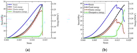 During the UCS experiment, the evolution of machine energy can be expressed by five different energies 5: Elastic energy is stored in the rock interior and escapes when the rock is deformed, it is the main source of energy disaster in rocks. Plastic energy occurs owing to the misalignment of the original crack and the yield of a secondary crack. Surface energy is the energy required for crack propagation when the fracture extends; hence, the plastic and surface energies are dissipative. Radiant energy will be produced when the coal and rock is loaded, and is a considerably lower than deformation energy. Kinetic energy will only be generated when the magnitude and rate of elastic energy release reach a certain level. To simplify the energy evolution of the rock during the uniaxial compression, kinetic and radiant energy were not considered. The plastic and surface energies combined to provide the dissipative energy [38,39,40].