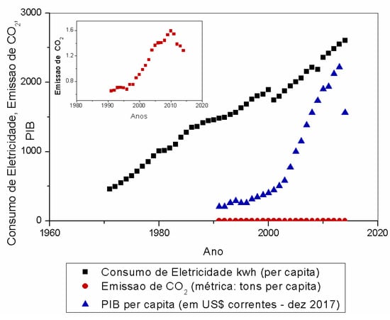 Gross Domestic Product (GDP), CO2 emission, and electricity consumption in Brazil in per capita values in a time series [].